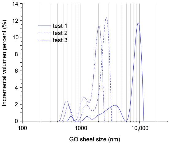 A dispersed GO in water with a concentration of 0.03 wt% was employed in this study from Graphenea. The elemental analysis in weight of GO presented is C (49–56%), H (0–1%), N (0–1%), S (2–4%) and O (41–50%). In Figure 2 the incremental volume percentage of GO sheet sizes in water suspension when it has not been yet sonicated or turned over is shown. As shown, the high variability in the results of the particle size distribution measurements indicate that the GO sheets in solution are randomly attached to each other, showing particle sizes between 0.42 and 10.1 μm. Three particle size measurements were performed on different mixtures with the same concentration to ensure the reliability of the results. It is worth noting the significant deviation of the particle size results when the dilution is not previously sonicated. The random adherence of the particles to each other makes the mixture totally inhomogeneous. This demonstrates how essential it is to properly sonicate the GO and to control the process. In this work, an exhaustive analysis of the ultrasonication process and its influence on the results was performed in Section 2.2.