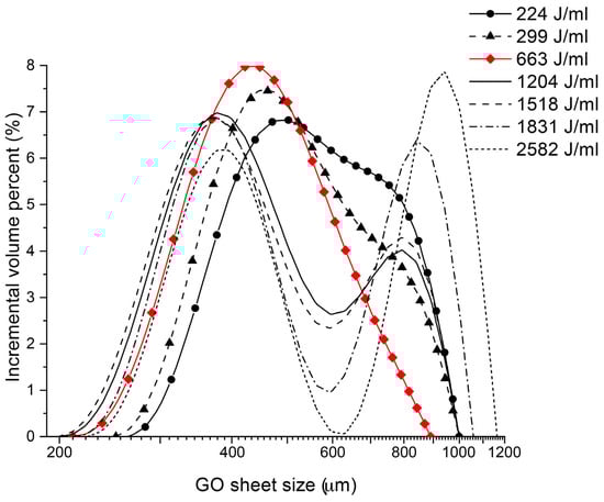 For sonication energies between 1204 and 2582 J/mL, the trend observed is increasing in mean GO sheet size from 0.492 to 0.639 μm, and the deviation of the results from 0.1 to 8.4%. It is worth noting that providing ultrasonication energy higher than 663 J/mL does not improve GO dispersion. Too-large power sonication results in a scissoring effect that breaks up the nanoparticles. Consequently, the power should be decreased as much as possible to guarantee a more homogeneous dispersion []. Based on the GO dispersion analysis performed, the most suitable ultrasonication energy has been set at 663 J/mL.