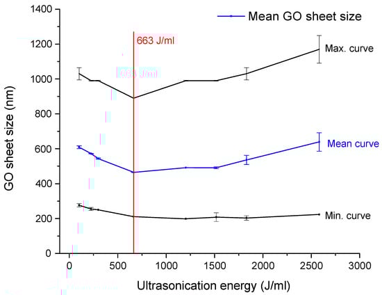 In Figure 4, the minimum, mean, and maximum values of GO sheet sizes and their deviation versus the ultrasonication energy transferred to suspension of 0.03 wt% (Table 2) is represented. As seen, infra-sonication and supra-sonication generate results of GO sheet sizes with higher deviation; this effect is more significant for the minimum and mean curves of particle size. On the other hand, a peak is clearly observed in the curves for the 663 J/mL energy case, which implies the smallest GO sheet size and the results with the lowest deviation.