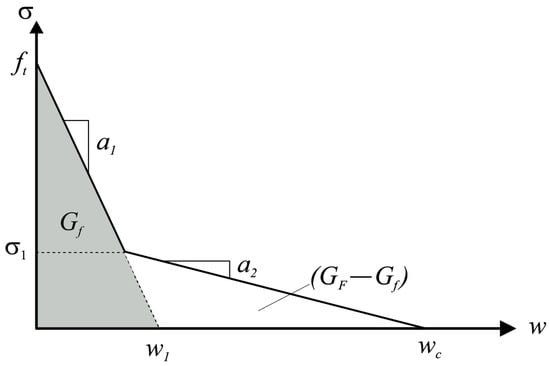 In addition, an inverse analysis using the non-linear hinge model [,,] was carried out to obtain the values of the bilinear tension softening graph (Figure 6). The bilinear graph is defined by the failure stress (ft), the displacement at failure (wu), the slope of the first branch (a1), and the slope of the second branch (a2) [].