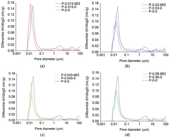 Differential porosity curves for (a) P–0.015, (b) P–0.030, (c) P–0.045, and (d) P–0.060.