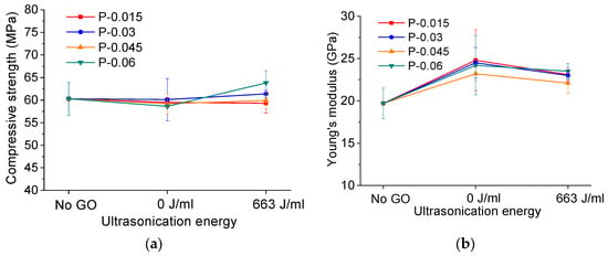 (a) Compressive strength and (b) Young’s modulus for each GO content and ultrasonication.
