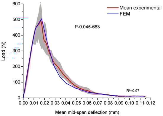 On the other hand, a two-dimensional FE model of the three-point bending test was developed and fitted to the experimental results, as described in Section 3.1, to identify the parameters that define the cohesive laws of each paste. Figure 11 shows the experimental and FE mean load-displacement curves for P–0.045–663. The minimum acceptable requirements for numerical fitting of the cohesive law parameters are an R-squared value greater than 0.95 of the FE results in relation to the experimental load-displacement curves. The cohesive laws and their parameters obtained with this procedure are shown in Figure 12 and Table 6, respectively.