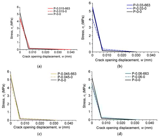Bilinear stress-crack opening displacement law: (a) 0.015%, (b) 0.030%, (c) 0.045%, and (d) 0.060% GO content.