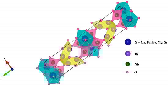 The crystal structure of BLSFs possesses the conventional formula (Bi2O2)2+(An−1BnO3n+1)2−. From the side view of the structure, the layers of Bi atoms are visible, in between of which the A and B site atoms are present (Figure 1). There is a total of 4 A-site atoms which can be divalent, like Ca, Ba, Be, Mg, Sr, etc., and 8 B-site atoms which can be Nb and Bi atoms, and there is a total of 36 atoms of oxygen in this structure, with a total of 56 atom possessing the orthorhombic structure, with a = 5.64, b = 25.40, c = 5.68, and α = β = γ = 90°.