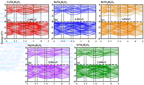 Band structure of BLSFs family: (a) CaNb2Bi2O9; (b) BaNb2Bi2O9; (c) BeNb2Bi2O9; (d) MgNb2Bi2O9; and (e) SrNb2Bi2O9.
