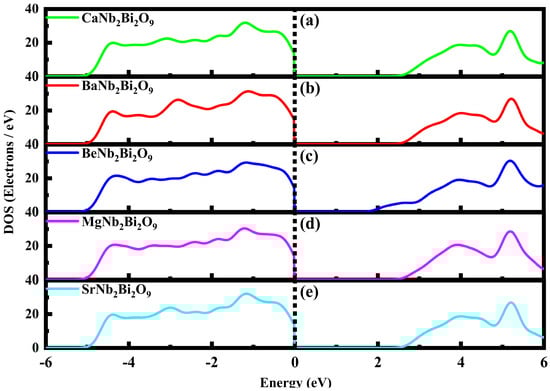 Density of states of (a) CaNb2Bi2O9, (b) BaNb2Bi2O9, (c) BeNb2Bi2O9, (d) MgNb2Bi2O9, and (e) SrNb2Bi2O9.