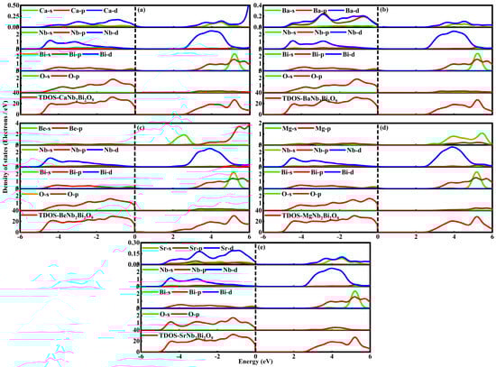 Partial density of states (PDOS) of (a) CaNb2Bi2O9, (b) BaNb2Bi2O9, (c) BeNb2Bi2O9, (d) MgNb2Bi2O9, and (e) SrNb2Bi2O9.
