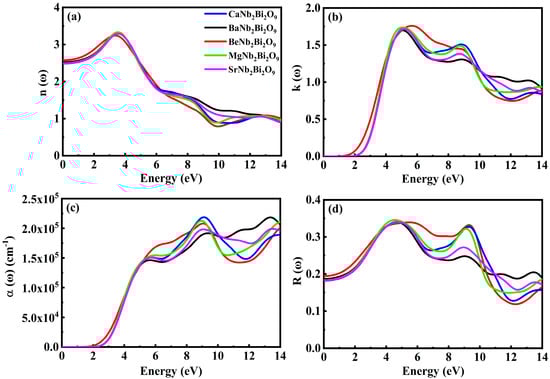Optical properties of XNb2Bi2O9 with X = Ca, Ba, Be, Mg, and Sr, (a) refractive index, (b) extinction coefficient, (c) absorption (cm−1), and (d) reflectivity.