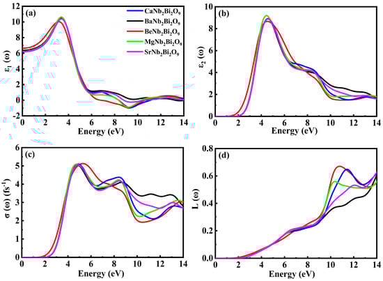 Figure 6a,b shows the Kramers–Kronig relation for the complex dielectric function , which can be used to describe the dielectric properties. Here, ε1(ω) represents the real part that is useful for measuring light polarization and dispersion, and ε2(ω) denotes the imaginary part that characterizes the material’s absorptive qualities []. The maximum values of ε1(ω) for XNb2Bi2O9 with X = Ca, Ba, Be, Mg, and Sr occur at 3.4, 3.35, 3.16, 3.39, and 3.38 eV, respectively. Following that, one may see a decline in the spectrum with rising energy. Direct optical transitions take place between VBs and CBs because the electronic band topologies show the direct bandgap. For these compounds, the static dielectric constants (a real component of the dielectric constant at zero energy) are 6.35 for (ε1). These outcomes show how these materials develop an anisotropic dielectric function. The orthorhombic structure is responsible for the dielectric constants’ anisotropic nature. The total of all transitions from VBs to CBs is known as ε2(ω). At an energy of 4.5 eV, the XNb2Bi2O9 (X = Ca, Ba, Be, Mg, and Sr) structure exhibits a maximum value in ε2(ω), occurring inside the visible light spectrum.