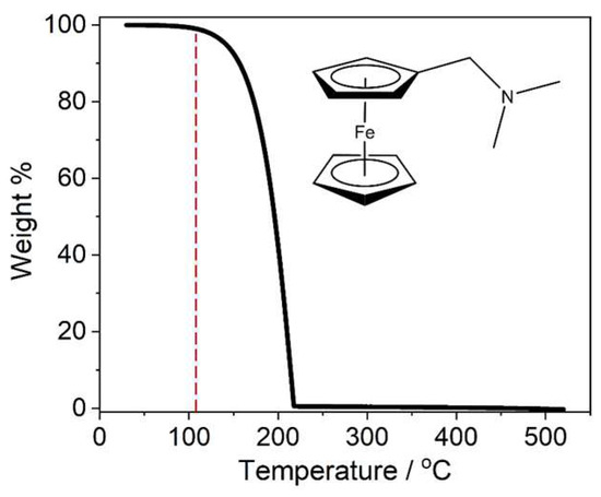 Thermogravimetric analysis of DMAMFc, measured under an Ar flow between 30 and 520 °C at a constant ramp rate of 5 °C min−1, with volatilisation onset marked with a red dashed line.