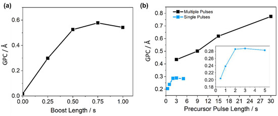 Growth per cycle (GPC) values (obtained by measurement of the final thickness of a grown film with a known number of cycles) from no boost to 1 s boost sequences (Figure 2a) reveal the significant enhancement in performance provided, and that the DMAMFc PEALD process is likely primarily limited by the precursor extraction from the pot into the chamber.