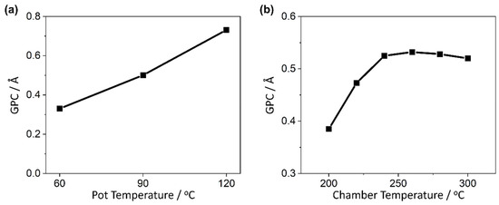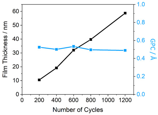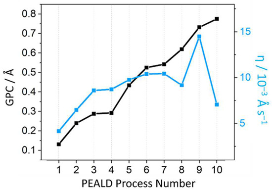 The GPC of a series of ALD processes with varying pulse sequences, pot temperatures, and chamber temperatures were recorded (Table 1, Figure 5). For practical application, a high GPC is not useful if each cycle is excessive in duration. A new efficiency parameter (η) was therefore introduced to account for this, calculated by dividing the GPC by the duration of each full ALD cycle, as in Equation (1):