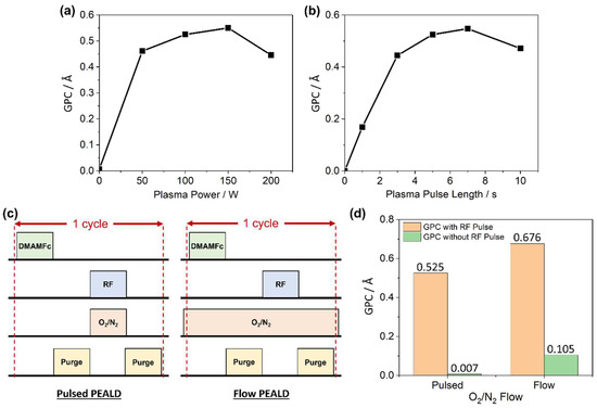 Optimisation of DMAMFc PEALD plasma parameters, comparing measured growth rate with (a) plasma power, and (b) plasma pulse length. All depositions completed with the defined ‘standard protocol’ except for the single varied parameter. (c) Comparison of pulse/purge/pulse/purge protocols for pulsed vs. flow plasma gas input, and (d) measured growth from pulsed vs. flow plasma gas protocols, with and without RF pulse.