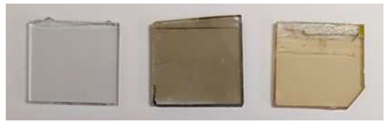 Appearance (from left to right) of: initial FTO-coated glass substrate, as-deposited 60 nm thin films, annealed 60 nm thin film (note that the silver area at the top is silver paint and not part of the sample).