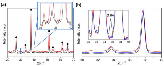 Grazing incidence X-ray diffraction patterns for pristine FTO (red), (blue) as-deposited Fe2O3 on FTO, and annealed Fe2O3 on FTO (black), measured at an X-ray incidence angle of 5° for ~12 h within a 2θ range of (a) 20–90° and (b) 30–40°. Insets show zoomed views of the peak of interest with XRD patterns overlayed. Peaks associated with FTO are marked with a black dot.
