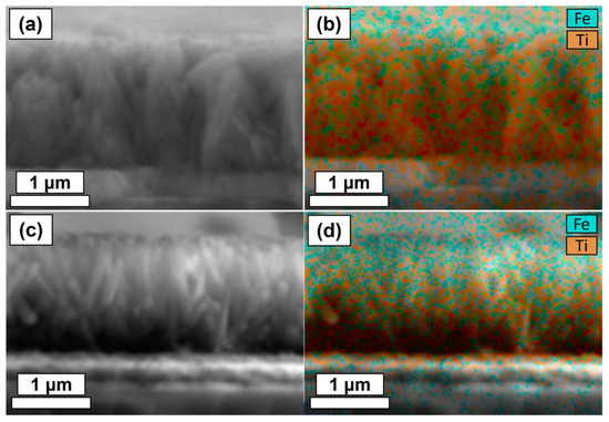 (a) FE-SEM cross-section image of TiO2/Fe2O3-30 nm, (b) electron image of TiO2/Fe2O3-30 nm overlayed with Fe (blue) and Ti (orange) series from EDX analysis, (c) FE-SEM cross-section image of TiO2/Fe2O3-60 nm, and (d) electron image of TiO2/Fe2O3-60 nm overlayed with Fe (blue) and Ti (orange) series from EDX analysis.