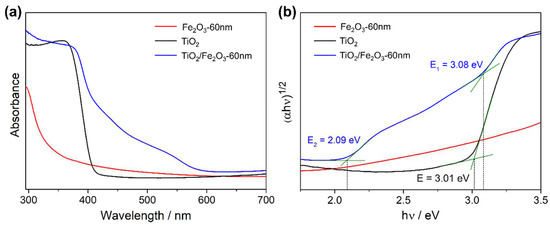 UV/Vis spectroscopy revealed a sharp absorption onset at 415 nm for the as-deposited TiO2 film (Figure 12a), corresponding to a 3.01 eV bandgap evaluated using the corresponding Tauc plot (Figure 12b), and the values matched those of the expected rutile polymorph. Interestingly, α-Fe2O3 showed no characteristic absorbance onset, however absorbance does appear to flatten at >600 nm, which matches the expected bandgap. It is likely that the film was too thin for clear absorption onset peaks, particularly when considering the low absorption coefficient of α-Fe2O3 (requiring a 375 nm thickness to absorb 95% of 550 nm incident light) [50]. The absorption spectra from the TiO2/Fe2O3 heterojunction contained two distinct absorption peaks at 595 nm and 405 nm, representing bandgaps of 3.08 and 2.09 eV, respectively. The 2.09 eV peak is within the expected range for α-Fe2O3 (1.9–2.2 eV) [58], and the 3.08 eV peak is between values for anatase (3.2 eV) and rutile (3.0 eV) TiO2. The presence of two TiO2 phases is unexpected, as it is known from a previous study [56] that the TiO2 nanorods are purely rutile when deposited onto FTO.