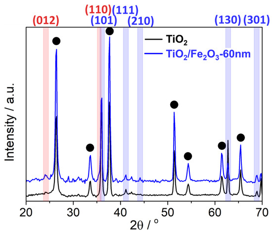 X-ray diffraction pattern for the pristine TiO2 nanorod and TiO2/Fe2O3-60 nm samples, both grown onto FTO-coated glass substrate. Peak locations corresponding to rutile TiO2 and a-Fe2O3 are highlighted in blue and red, respectively, and FTO is marked with a black dot.