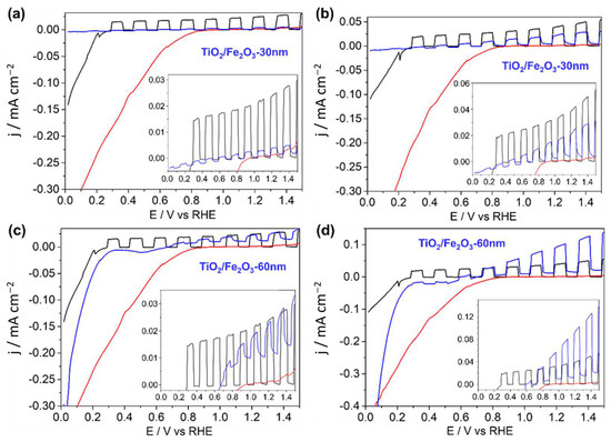 Linear sweep voltammograms under one sun-chopped AM 1.5 (a,c) front, (b,d) rear illumination for (black) TiO2, (red) 30 nm α-Fe2O3, ((a,b); blue) TiO2/Fe2O3-30nm, ((c,d); blue TiO2/Fe2O3-60 nm). Insets contain zoomed-in views ignoring the cathodic current density baseline shift. All measurements performed in 1 M KOH (pH 13.7) with a 15 mV s−1 scan rate.