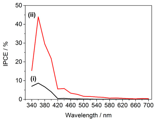 IPCE measurements for TiO2 and TiO2/Fe2O3-60 nm (the highest performing heterojunction) thin films were carried out to further investigate the photoelectronic impact of the α-Fe2O3 coating (Figure 15). TiO2 possessed the expected trend given its large bandgap, the IPCE only significantly increasing above zero at <420 nm (2.95 eV) incident photon wavelength and peaking at 360 nm (3.44 eV). Over this range, the IPCE of the TiO2/Fe2O3-60 nm-layered film was enhanced significantly, increasing from 8.5% to 43.5% at 360 nm. While this could be partly due to increased photon absorption, the α-Fe2O3 layer was significantly thinner than TiO2, so considering that the wavelength was within the bandgap of TiO2, the addition of α-Fe2O3 was not expected to significantly increase the total 360 nm photon absorption of the electrode. The increased performance must therefore be linked to improved charge separation due to the heterojunction formation, and therefore the band alignment must, in fact, become preferential (type-II heterojunction) for electron-hole separation upon semiconductor contact [59,60]. The narrower bandgap of α-Fe2O3 (measured as ~2.09 eV, Figure 12) results in IPCE above zero for incident wavelengths greater than the 420 nm cut-off seen in TiO2. Interestingly, despite measuring the ~2.09 eV (593 nm) bandgap, the IPCE of TiO2/Fe2O3-60nm remained above zero up to ~620 nm (2.0 eV), the lower limit of the accepted α-Fe2O3 bandgap range.