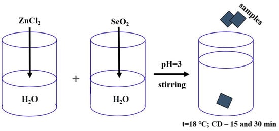 For ZnSeO3 deposition, solutions of zinc chloride (ZnCl2)—4 g/L and selenium dioxide (SeO2)—0.2 g/L in 100 mL of distilled water were prepared separately at room temperature and then mixed at pH = 3. Chemical deposition (CD) of precipitates in the track template samples was carried out under continuous stirring at a solution temperature of 18 °C. At 18 °C, the deposition process can be more precisely controlled, ensuring the stability of the solutions and minimizing unwanted side reactions. The duration of CD was varied from 5 to 60 min. Figure 1 depicts a brief scheme of the deposition process.