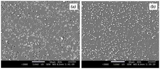 SEM images of the sample’s surface after chemical deposition for (a) 15 and (b) 30 min at 18 °C.