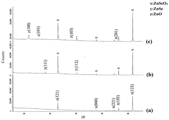To improve the crystallinity and decrease the defect level of nanostructured semiconductors, their synthesis is generally carried out at elevated temperatures. An efficient tool to tune the properties of semiconductor nanomaterials is also post-synthesis annealing. Additionally, heat treatment provides the possibility to estimate the thermal stability of the created nanostructures. The effect of high-temperature treatment on ZnSeO3 nanostructures is under-researched, and there are only a few works in this field. For instance, the authors of [12] estimated the influence of deposition temperature in the range of (25 to 650 °C) on the structural and optoelectronic properties of Zn (O, Se) layers grown via pulsed laser vacuum deposition. They reported that polycrystalline and electrically conductive Zn (O, Se) layers were grown at the substrate temperatures of 500–650 °C. The layers grown at temperatures below 500 °C were amorphous and exhibited a semi-insulating behavior. In [20], the thermal stability of hydrates of ZnSeO3, their dehydration, and dissociation were investigated in a temperature range of (25–600 °C) under environmental conditions. It was shown that anhydrous ZnSeO3 presumably existed at a high temperature (up to 480 °C) and broke down within a temperature interval of 480–600 °C to form ZnO and SeO2.