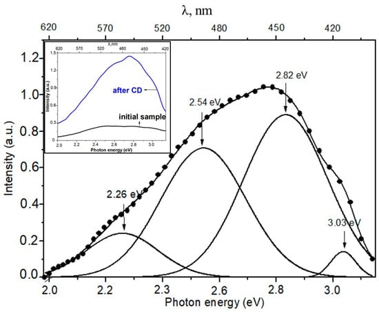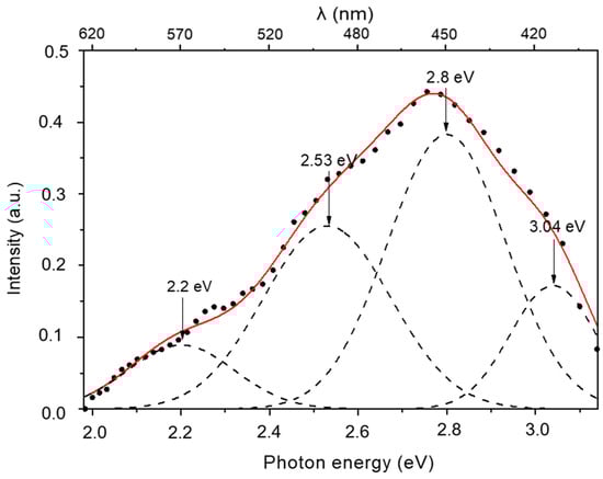 PL spectra were recorded in the range of 320 to 700 nm using a CM2203 spectrofluorometer (Solar, Minsk, Belarus) with Xe-lamp radiation at λ = 240 nm. Using two double monochromators ensured a minimum level of interference, guaranteeing high measurement accuracy. In all cases, we also subtracted the emission of the initial SiO2nanoporous/Si template from the resulting Pl spectra of templates with deposited precipitates.