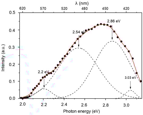 A wide band in the range of 400 to 600 nm dominates all spectra. It can be approximated by four Gaussian curves with maxima at ~550 nm (2.2 eV), 488 nm (2.54 eV), ~440 nm (2.82 eV), and 410 nm (3.03 eV). One can expect that the ZnSeO3 luminescence is a combination of luminescence from ZnSe and ZnO. According to [26] the green emission around 550 nm can be ascribed to deep-level trap emission originating from oxygen deficiency. The band at 488 nm is possibly due to some donor–acceptor pairs associated with Zn/Se vacancies and intermediate states [27]. The blue emission at around 440 nm, according to [28], can be ascribed to defects in ZnO caused by the presence of oxygen atoms in the interstices of the crystal lattice. The band at 410 nm can be attributed to the violet emission of ZnO nanoparticles and is probably due to the complex defects involving Zni and VZn and related to the interface traps at the ZnO grain boundaries [29].