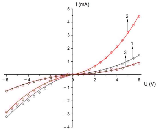 The experimental current–voltage curves are in good agreement with a scenario predicted by Formula (6). In more detail, current density could be described by the Pool-Frenkel-type equation [33] (ν = 1):