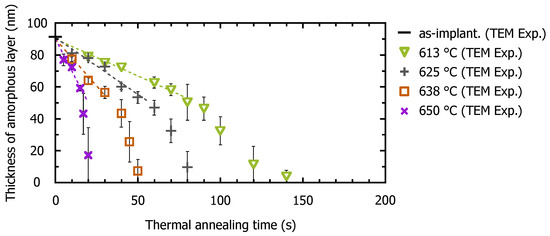 Changes in thickness of the amorphous layer of C3H5-molecular-ion-implanted Si substrate after thermal annealing treatments at 613 °C, 625 °C, 638 °C, and 650 °C. The error bars in each plot indicate the deterioration of the a/c interface roughness during recrystallization.