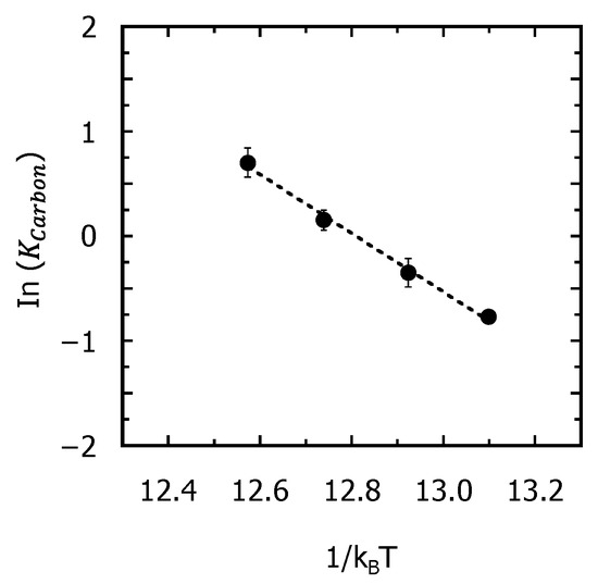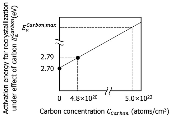 where is the experimentally obtained activation energy for recrystallization in the presence of carbon, which is 2.79 eV as shown in Section 3.1, and is the carbon concentration in this situation, which is 4.8 × 1020 atoms/cm3. In addition, is the activation energy for recrystallization in the absence of impurities as reported previously, which is 2.70 eV [13]. Furthermore, the Si concentration is set as 5.0 × 1022 atoms/cm3. As a result, the calculated recrystallization activation energy is derived as 12.0 eV, as shown in Figure 12.