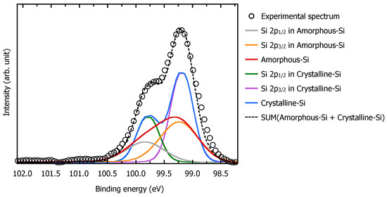 Furthermore, the crystalline fraction of the Si substrate surface is quantitatively derived from these binding energies of Si 2p spectra using ideal amorphous-Si and crystalline-Si spectra [45,46]. We performed curve fitting to minimize the difference between the sum of the ideal amorphous-Si and crystalline-Si spectra and the experimental spectrum as shown in Figure 7. Then, the crystalline fraction of the Si substrate surface is determined as