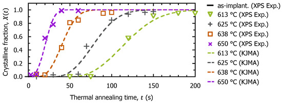 As a result of the analysis of binding energy of 2p spectra, we show in Figure 8 the changes in the crystalline fraction of the fully amorphized C3H5-molecular-ion-implanted Si substrate surface after thermal annealing treatments at 613 °C, 625 °C, 638 °C, and 650 °C. The crystalline fraction of the Si substrate surface is approximately 0 after C3H5 molecular ion implantation. Then, as the thermal annealing time increases, the fully amorphized C3H5-moelcular-ion-implanted Si substrate surface recrystallizes gradually with a sigmoidal curve to a perfect crystal. It is also seen in Figure 8 that the slope of the sigmoidal curve increases with the thermal annealing temperature. We interpret the sigmoidal curve of the changes in the crystalline fraction of the fully amorphized C3H5-molecular-ion-implanted Si substrate after thermal annealing treatments as a type of phase transformation phenomenon. Then, we analyze the transition from the amorphous to the crystalline phase on the basis of the KJMA theory. The change in the crystalline fraction in the KJMA equation is expressed as