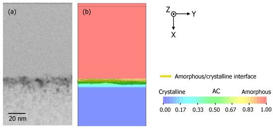We applied TCAD process simulation to analyze the amorphization of the Si substrate induced by C3H5 molecular ion implantation and the recrystallization behavior during the subsequent thermal annealing treatment. Both the C3H5 molecular ion implantation and the thermal annealing treatment were simulated using TCAD process simulation software (Sentaurus™ process, Synopsys, Sunnyvale, CA, USA) [35]. The simulation model was a Si single crystal, and the size was 80 nm in length, 80 nm in width, and 800 nm in height. The native oxide thickness on the simulation model was set at 1.0 nm.
