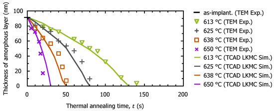 Equation (7) is introduced into Equation (2) as the parameter of the effect of carbon concentration on the recrystallization rate. Figure 13 shows the changes in the thickness of the amorphous layer formed in the simulation model after thermal annealing treatments at 613 °C, 625 °C, 638 °C, and 650 °C. It is confirmed that the changes in the thickness of the amorphous layer of the TCAD simulation model correspond to those in TEM observations in the experiment. The simulation results also show that the recrystallization rate decreases at depths from 90–50 nm where the carbon concentration is approximately 4.8 × 1020 atoms/cm3, as in the experiment.