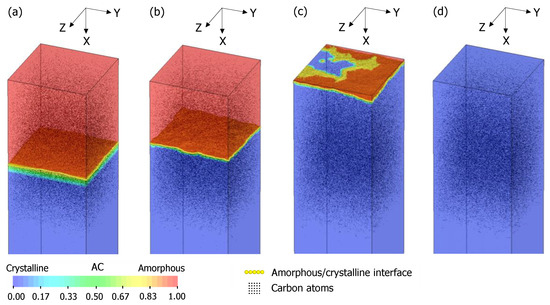 Figure 14 shows the distribution of carbon atoms at the a/c interface after the thermal annealing treatment at 650 °C for 25 s. At the a/c interface, carbon atoms are not distributed uniformly, and there are some areas of high and low carbon concentrations. In addition, Figure 15 shows the simulation models after C3H5 molecular ion implantation at a dose of 1.67 × 1015 ions/cm2 and thermal annealing treatments at 650 °C for 10 s, 27 s, and 40 s. The a/c interface appears flat after C3H5 molecular ion implantation in Figure 15a. However, the high-concentration carbon in the a/c interface partially delays recrystallization, as shown in Figure 15b. Then, in Figure 15c, some crystalline region reaches the surface first owing to the partial delay of recrystallization in the fully amorphized C3H5-molecular-ion-implanted Si substrate. Figure 15d shows the complete recrystallization of the amorphous layer in the C3H5-molecular-ion-implanted Si substrate after the thermal annealing treatment at 650 °C for 40 s.