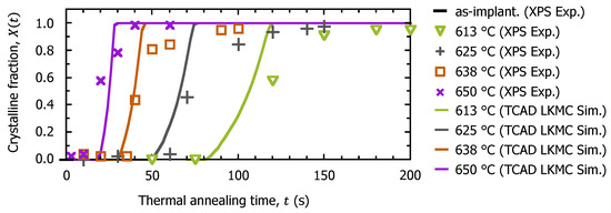 Secondly, we calculated the recrystallization behavior of the C3H5-molecular-ion-implanted simulation model during thermal annealing treatment. In the simulation, thermal annealing treatments were performed at 613 °C, 625 °C, 638 °C, and 650 °C for 5–200 s in N2 ambient, as in the experiment. To define the a/c interface and calculate the recrystallization behavior considering the crystal orientation, we applied the lattice kinetic Monte Carlo (LKMC) code [39]. In the LKMC code, the recrystallization frequency was assigned to each amorphous defect particles located at the a/c interface as