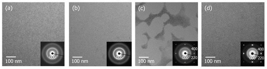 To demonstrate the two-dimensional recrystallization analyzed on the basis of the KJMA theory and TCAD process simulation, we conducted plan-view TEM observations of the fully amorphized C3H5-molecular-ion-implanted Si substrate surface after the thermal annealing treatment at 650 °C. Figure 17 shows plan-view TEM images of the Si substrate surface after C3H5 molecular ion implantation at a dose of 1.67 × 1015 ions/cm2 and thermal annealing treatments at 650 °C for 10 s, 20 s, and 40 s. The sample thickness of the plan-view TEM observation is approximately 40–60 nm. The spots of the SAED pattern have a diameter of 100 nm. As shown in Figure 17a,b, the Si substrate surface is fully amorphized after C3H5 molecular ion implantation and does not change after thermal annealing at 650 °C for 10 s. The ring in the SAED pattern that indicates an amorphous structure is also unchanged. However, after the thermal annealing treatment at 650 °C for 20 s, it is seen that crystal islands grow two-dimensionally on the C3H5-molecular-ion-implanted Si substrate surface, as shown in Figure 17c. Then, the Si substrate surface becomes completely crystalline after the thermal annealing treatment at 650 °C for 40 s, as shown in Figure 17d. In the SAED pattern, corresponding to the recrystallization of the surface, spots due to single-crystal Si are clearly observed. In the following final section, we summarize experimental and simulation results and propose the surface recrystallization model of the fully amorphized C3H5-molecular-ion-implanted Si substrate.