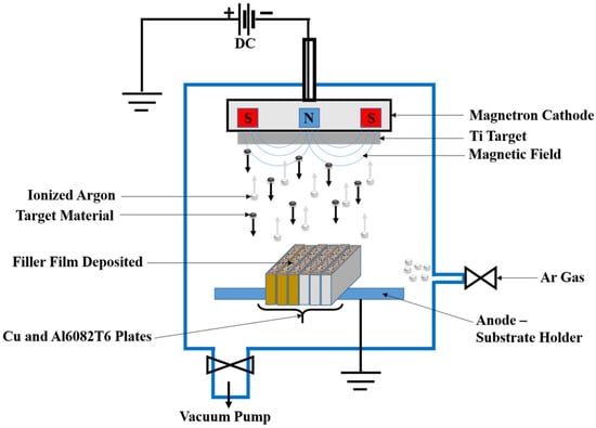 Pure copper (Cu) and an Al6082T6 aluminum alloy were used in the experiments. Welding plates with dimensions of 100 × 50 × 8 mm were used. A thin film of Ti was deposited on the cross-sections of the plates with dimensions of 100 × 8 mm. Prior to the deposition stage, the process of cathodic cleaning was performed using the following technological conditions: Ar gas pressure of 8 × 10−2 mbar, plasma potential of 900 V, and plasma current of 0.1 A, for 10 min. Second to this process, the filler layers were deposited at a working pressure of 1 × 10−3 mbar. The power of the discharge process was 440 W, with the current being set to 1 A. The Ti film was sputtered for 180 min. The thicknesses of the coatings are in the range of 9–10 μm, depending on the studied sample. The large variation of the thickness is caused by the large area of deposition, which causes irregularities in the coatings’ growth rates. The process of the deposition of the filler layers is schematically represented in Figure 1.