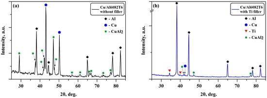 Figure 3 shows the results of the X-ray diffraction experiments performed on both samples. Figure 3a shows the results obtained for the sample prepared without any filler materials, and Figure 3b shows the results obtained for the sample prepared using Ti filler. All obtained diffraction patterns do not exhibit the presence of amorphous-like halos, which confirms that during the welding process, the entire volume of the weld seam successfully recrystallized and formed its characteristic polycrystalline structure. During the experiments, copper and aluminum phases were detected in their typical face-centered cubic (fcc) crystal lattice structure. A titanium phase with a hexagonal closed-packed (hcp) crystal structure was also observed in the case of the sample in which the Ti filler was used during the welding process. In both cases, intermetallic phases were also detected, in particular, the CuAl2 phase, which has a tetragonal crystal structure []. Comparatively, it is estimated that a much higher intensity of CuAl2 diffraction maxima is observed in the case of the first sample. Also, in the case of the second sample, only a single diffraction peak of the Cu phase was detected. This suggests two things. Firstly, the application of the Ti filler and the employment of a beam offset toward the aluminum plate limited the applied heat to the copper plate. This, in turn, limited the quantity of the molten Cu phase, which was introduced in the welded joint. As mentioned above, even small quantities of copper in the aluminum solid solution are enough to oversaturate it, beyond which point an uncontrollable formation of IMCs occurs. It is possible that the application of the Ti filler limited the concentration of copper in the weld pool, thus also limiting the formation of IMCs.