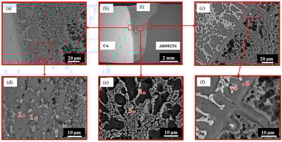 SEM images the cross-section of the Cu/Al6082T6 specimen with Ti filler: (a) interface between the copper plate and zone of fusion; (b) whole weld seam; (c) FZ-Al6082T6 interface; (d) image of the Cu-FZ interface; (e) image of the FZ; (f) image of the interface between the zone of fusion and the Al6082T6 alloy.