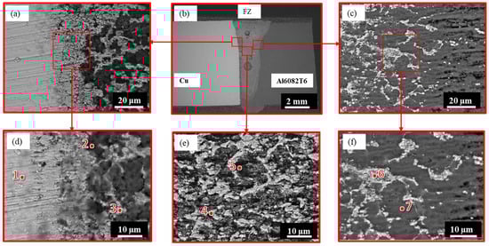 In Figure 4, different magnification SEM images are presented of the cross-section of the weld seam of the Cu/Al6082T6 joint without the filler. The cross-section of the formed butt joint, as shown in Figure 4b, suggests that the full penetration of the weld beam in the structure of the plates was achieved. The standard for EBW “keyhole” shaped weld seam has formed, with most of its contents seemingly being composed of aluminum. Figure 4a shows a zoomed image of the border between the fusion zone (FZ) and the copper plate. Figure 4d shows an even more zoomed image of the same area, consisting of an unevenly mixed compound. In order to further investigate and differentiate them an EDX analysis was performed, and the results are summarized in Table 1. The points marked as “1” and “2” in the image were studied. The results showed that in the case of the first point, a predominantly copper content was found. In the case of the second point, a 65%/35% mixture of aluminum and copper was reported. This suggests that the point either contains formations of IMCs or a mixture of an αAl solid solution with IMC incisions of the type αAl + IMCs. Figure 4c depicts an image of the boundary between the zone of fusion (FZ) and the aluminum plate. Figure 4f depicts a zoomed image of that area. Much more pronounced agglomerates are visible in this case. Once again, an EDX analysis was performed, and the composition of points “5” and “6” was studied. Apparently, the visible agglomerates have a 70%/30% Al/Cu composition, which corresponds to the CuAl2 phase. In the case of point “6” an almost pure aluminum composition was detected. Finally, a zoomed image of the center of the weld seam is given in Figure 4e. Large agglomerates are visible in this case, with a seemingly larger density compared to those closer to the aluminum plate. Once again, their composition was studied using EDX, and it was confirmed that those agglomerates (point “3”) have the same composition as the ones shown in Figure 4f, namely, a 70%/30% mixture of Al/Cu. Point “4” exhibited an almost pure aluminum content. This suggests that most probably, the agglomerates observed in the case of this sample, both in the center of the weld seam and along its edges, belong to the CuAl2 intermetallic phase. These results are confirmed by the previous investigations of Cai et al. [], who have studied the microstructure and properties of cold metal transfer welded joints of Cu and Al.