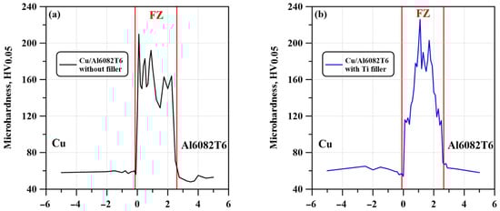 The measured microhardness is given in Figure 6. Figure 6a depicts the results for the sample formed without using a filler. The microhardness of the aluminum plate is about 60 HV0.05, and the microhardness of the copper plate is about 50 HV0.05. Entering the fusion zone, the microhardness values rapidly spike and reach maximum values of 210 HV0.05. Large fluctuations of the values are observed, with the lowest detected value being 128 HV0.05. The large fluctuations suggest that the structure of the weld seam is highly non-homogeneous. Figure 6b shows the results of the microhardness measurements of the sample produced with the Ti filler. The microhardness of the plates is about the same as in the previous sample and is typical for these kinds of materials [,]. However, a noticeable difference is present in the microhardness of the fusion zone. A smooth increase in the microhardness from the Cu plate toward the FZ is observed, followed by a smooth decrease going toward the Al plate. The maximum microhardness measured in the fusion zone was 235 HV0.05, and the lowest was 165 HV0.05. Proportionally, the first sample exhibited a microhardness difference from the maximum to the minimal value of 82 HV0.05, and the Ti filler sample exhibited a value of 70 HV0.05. Evidently, the difference is not too high; however, the Ti filler sample does indeed exhibit a slightly better unification of the measured values. For this reason, it can be concluded that the structure of the Ti filler sample is slightly more homogeneous. Regarding the microhardness values themselves, a study of the microhardness in the interface between Cu and Al composites was carried out by the authors of [], who have found a direct correlation between the cooling rate and the resultant microhardness. They reported that an increase in the cooling rate leads to an increase in the microhardness []. This trend is also true regarding the results of this work since electron beam welding is characterized by a high cooling rate []. Due to this, the resultant hardness in the fusion zone has high values. In addition, the introduction of the Ti filler in the second sample results in a smooth increase in the microhardness since the highest cooling rate is observed in the middle of the weld seam. The Ti filler apparently sufficed to modulate the cooling rate by slowing it down closer to the base materials. This is confirmed by both the SEM and XRD analyses. It is also important to mention that the microhardness of the Al6082T6 alloy, as mentioned above, is theoretically supposed to be much higher. This microhardness is achieved by means of a heat treatment process; however, previous studies have proven that applying heat above 300 °C to heat-treated aluminum alloys reverses the process of heat treatment, and the alloy once again exhibits its original structural and mechanical properties [].