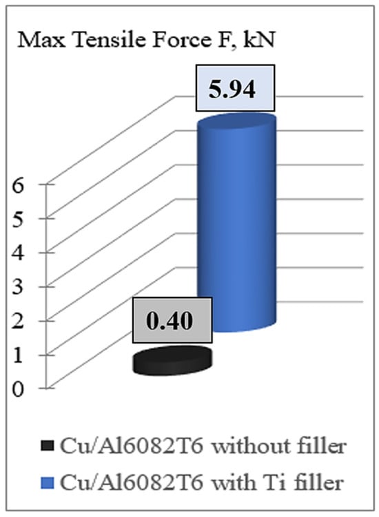 The fine structure affects the mechanical properties of the compound. The finer the structure, the higher the tensile strength []. Our results fully agree with this statement. The application of titanium filler led to an increase in the maximal tensile force by more than an order of magnitude. Other authors also report an increase in the maximal tensile force of a copper–aluminum joint after filler application. For example, a maximal tensile force of 800 N was achieved in the laser micro-welding of Cu and aluminum with the use of silver foil versus 400 N without filler [].
