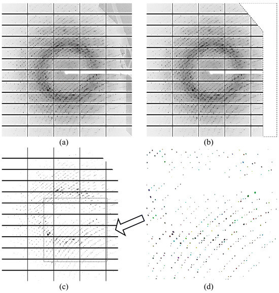 The series of processing steps for diffraction images: (a) original diffraction image; (b) shadow area masking and grayscale conversion; (c) binarization; (d) partial visualization results using the connected components analysis algorithm, each diffraction spot is assigned with different colors, which means each diffraction spot can be accurately located.