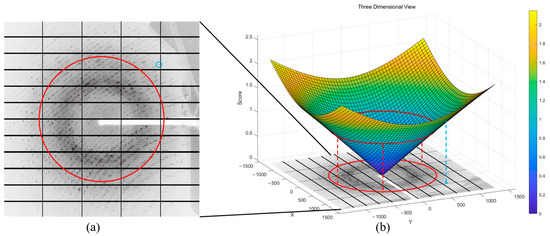 Three-dimensional visualization of the scoring mechanism. The red circle in (a) represents the projection of points with a score equal to 1 in (b) on the diffraction result map. The score of the diffraction spot circled by blue circles in (a) can be obtained from the score surface in (b).