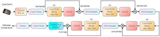 A protein-crystal-quality-classification network based on ConvNeXt is proposed, which adopts a multi-stage design in which different stages are responsible for extracting feature maps of different resolutions. The network consists of four stages, with the number of ConvNeXt blocks set as (3, 3, 9, 3) for each respective stage. After the first three stages, a down-sampling module is applied, comprising a regularization module and a convolutional layer. Subsequently, the feature maps obtained from four stages are transformed into probability-distribution outputs through global average pooling and a fully connected layer. To enhance network’s attention towards important features within protein crystal images, the CBAM module is integrated into the ConvNeXt network. Additionally, inspired by ResNet [24], skip connections are included to retain crucial crystal features from the previous feature map during the convolution process. The improved network structure is illustrated in Figure 4.