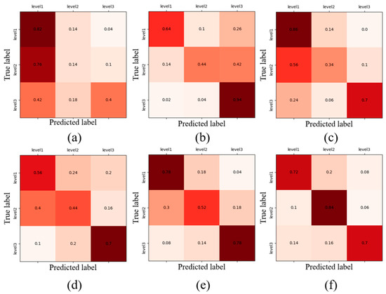 Classification confusion matrix of each network: (a) Vision Transformer; (b) ConvNeXt; (c) ConvNeXt + SA; (d) ResNet50; (e) ConvNeXt + ECA; (f) ConvNeXt + CBAM.